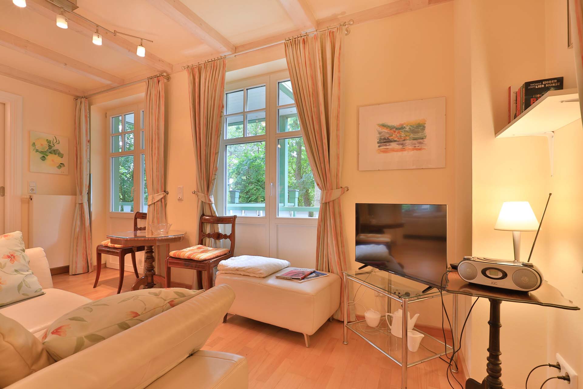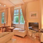 Die 2- Zimmer Suite Eisvogel befindet sich im Hochparterre des Landhauses Victoria. Das bezaubernde Appartement verwöhnt mit einem Balkon, von dem eine Treppe zum Waldparkgarten führt. Mit einer Wohnfläche von 29m² ermöglicht die nahezu vollständig eingerichtete Suite einen romantischen Urlaub für 2 Personen auf kleinem Raum.