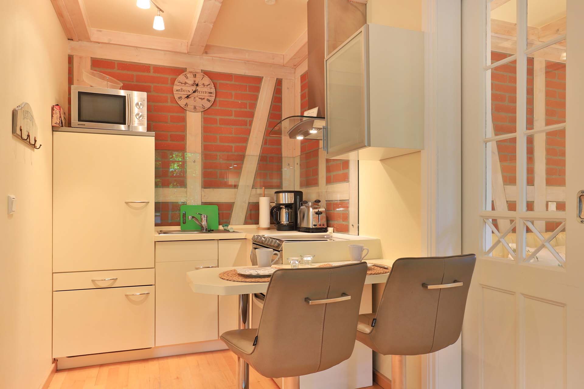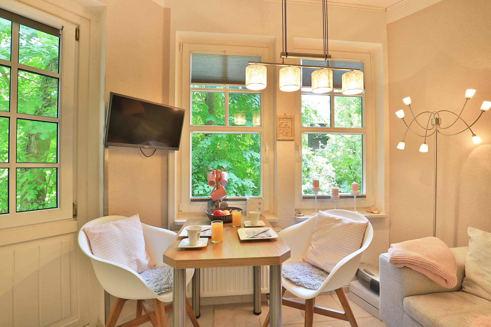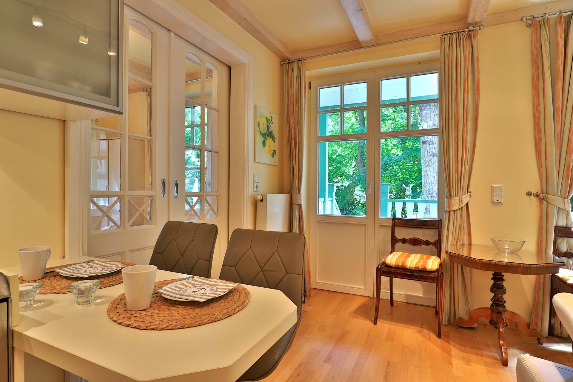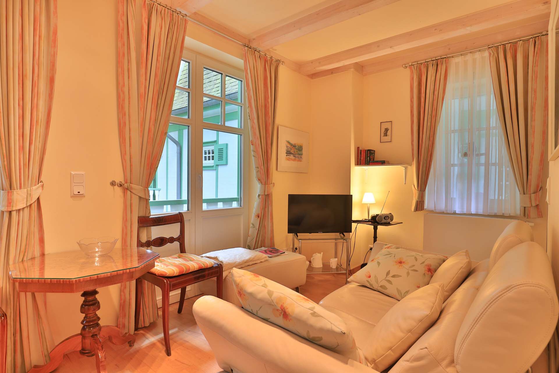 Die 2- Zimmer Suite Eisvogel befindet sich im Hochparterre des Landhauses Victoria. Das bezaubernde Appartement verwöhnt mit einem Balkon, von dem eine Treppe zum Waldparkgarten führt. Mit einer Wohnfläche von 29m² ermöglicht die nahezu vollständig eingerichtete Suite einen romantischen Urlaub für 2 Personen auf kleinem Raum.